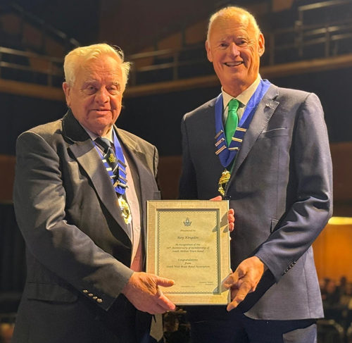 As well as presenting trophies to the winners, SWBBA were delighted to present our much-loved and respected Chairman, Ray Kingdon, with a certificate to mark his incredible seventy year membership of South Molton Town Band. Ray is not only a true stalwart of the band (and SWBBA), he is prolific figure in his home town of South Molton where he and his wife Gwen are involved with all kinds of charity work. Congratulations Ray - what an achievement! Pictured presenting the certificate to Ray is SWBBA president Leonard Adams.